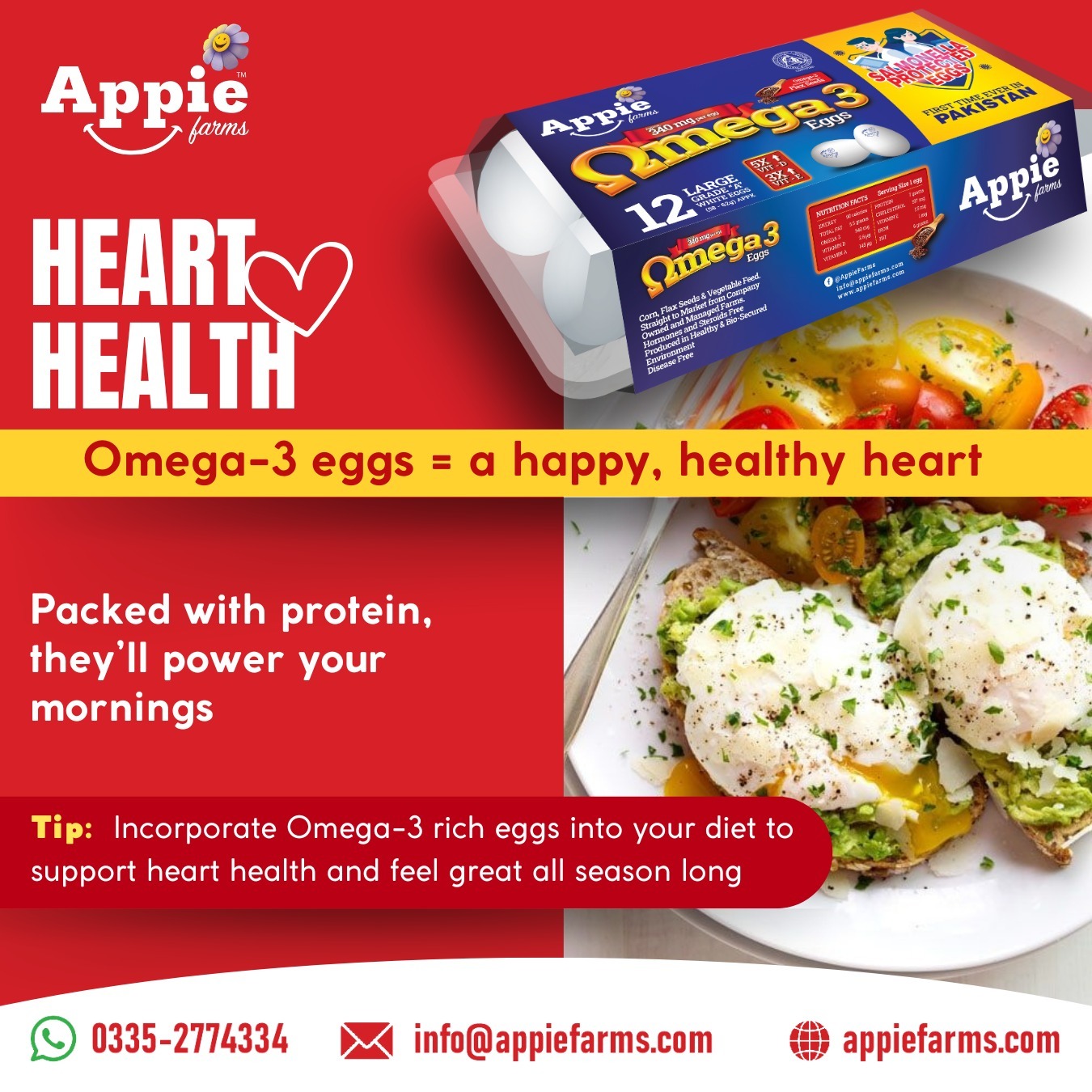 Rich in Omega-3 fatty acids, Appie Farms Omega-3 Eggs are a smart choice for heart health and overall wellness. Each egg is carefully enriched to provide essential nutrients, ensuring a healthier you. Freshly sourced from our sustainable farms, these 06 & 12-piece pack delivers unmatched quality and flavor for your family.